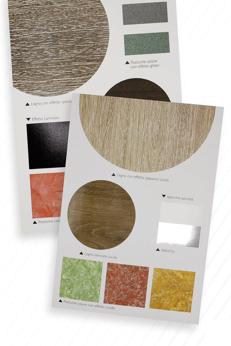 Ideostampa vanta una lunga esperienza nella realizzazione di cartelle e mazzette colore con stampa litografica di tinte piatte o ad effetto, con simulazione in quadricromia di finiture decorative o essenze in legno. Con la serigrafia inoltre è possibile aggiungere al colore anche la finitura di superficie, lucida, opaca o a spessore così da costituire una vera alternativa ai campioni reali.