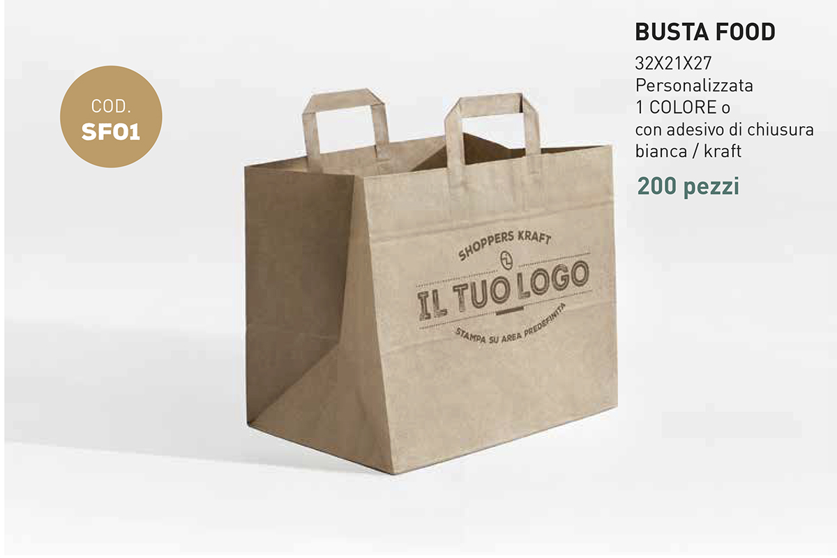 Busta food 32x21x27cm con manici, adatta per trasportare i vostri contenitori da asporto, disponibile in carta bianca o kraft avana