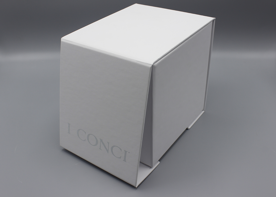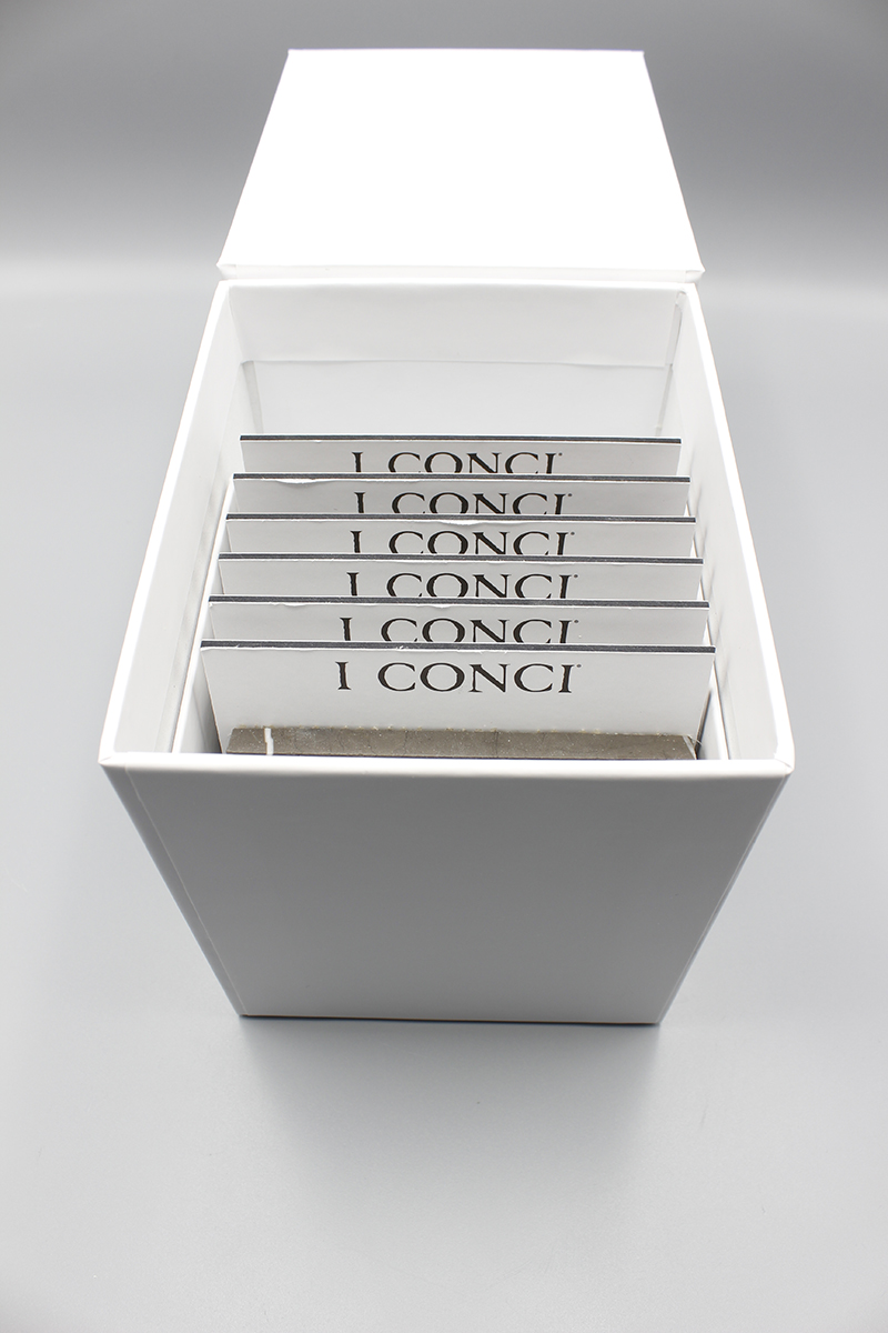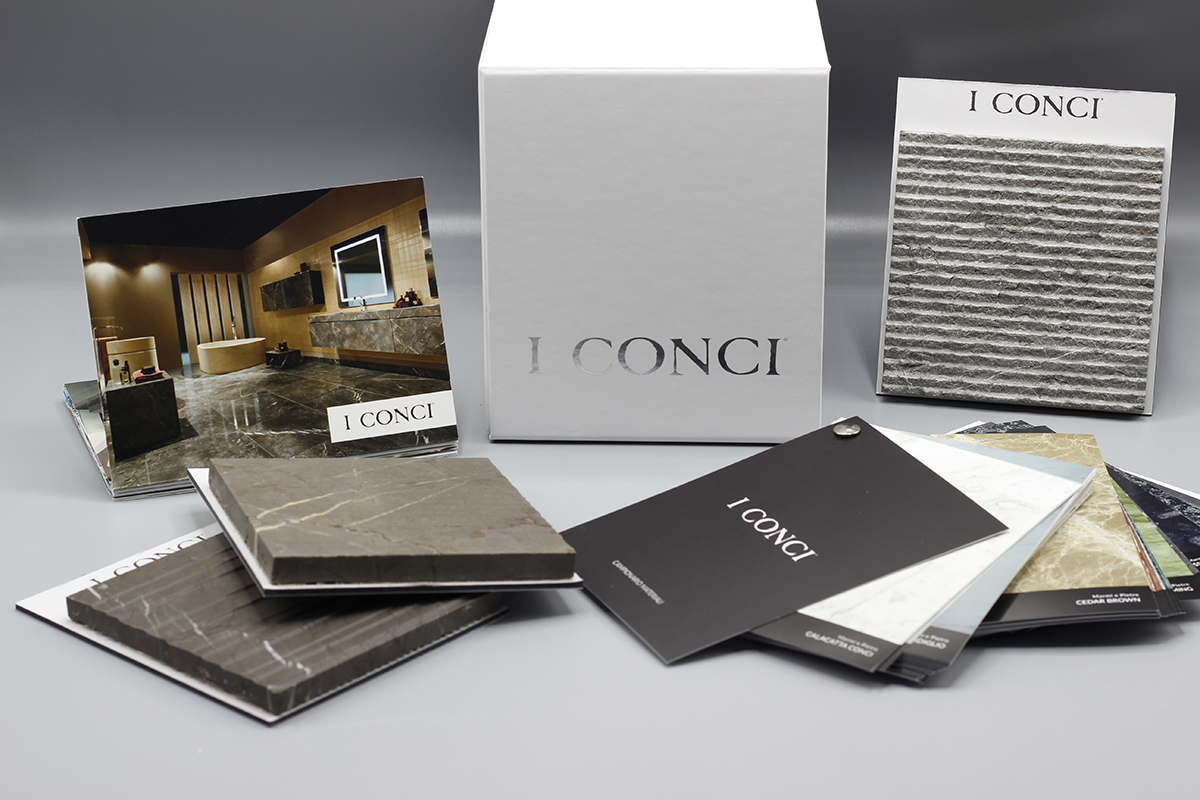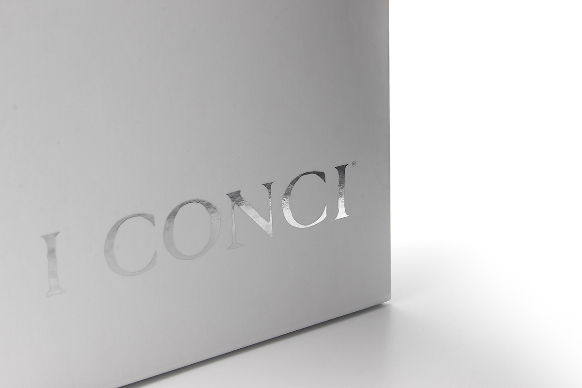 L’esigenza de I Conci era di realizzare una “scatola” che rappresentasse al meglio l’azienda al cospetto di interlocutori importanti quali clienti, designers, rivenditori e progettisti e che riassumesse i poliedrici aspetti progettuali e produttivi delle sue collezioni e non solo. Così è stato proposto dallo studio grafico Prluralecom una scatola non molto grande che contenesse più materiali e che potesse essere spedita in tutto il mondo e conservata facilmente sul tavolo o ben riconoscibile se riposta a scaffale. Box I Conci diventa così uno strumento immediato quanto un semplice contenitore identitario di grande eleganza rivestito in cartoncino bianco in carta plastificata opaca stampato con soltanto il logo sul fronte in argento a caldo ed accoppiato ad un cartone G/G da 2,5 mm.