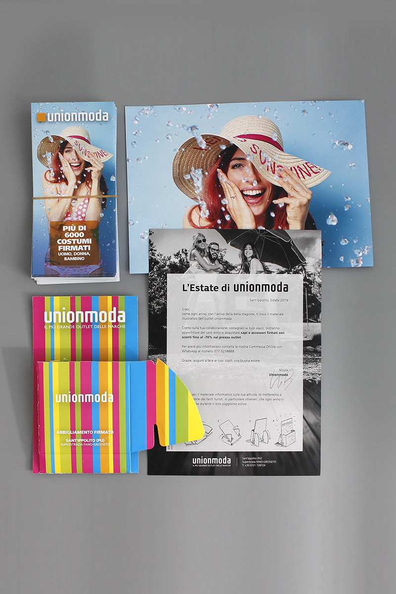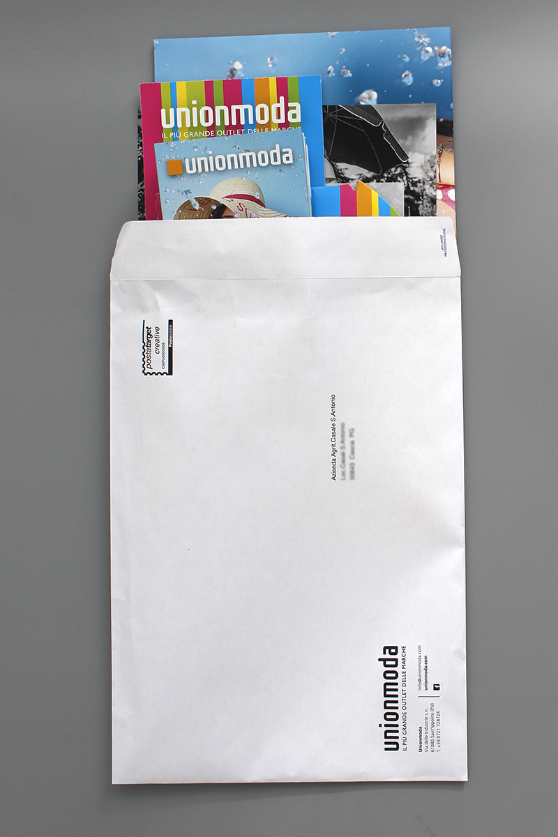 Un esempio è la campagna pubblicitaria di Unionmoda, per essere vicina al proprio territorio, invia una busta a sacco stampata con l’inserimento dell’indirizzo con locandina, porta depliant, volantini e lettera di presentazione per conoscere l’outlet.