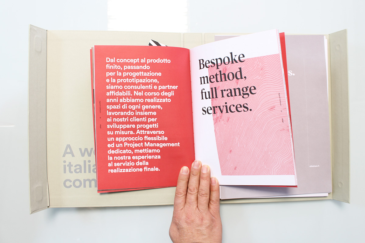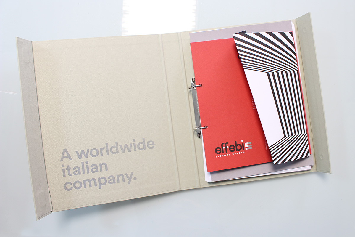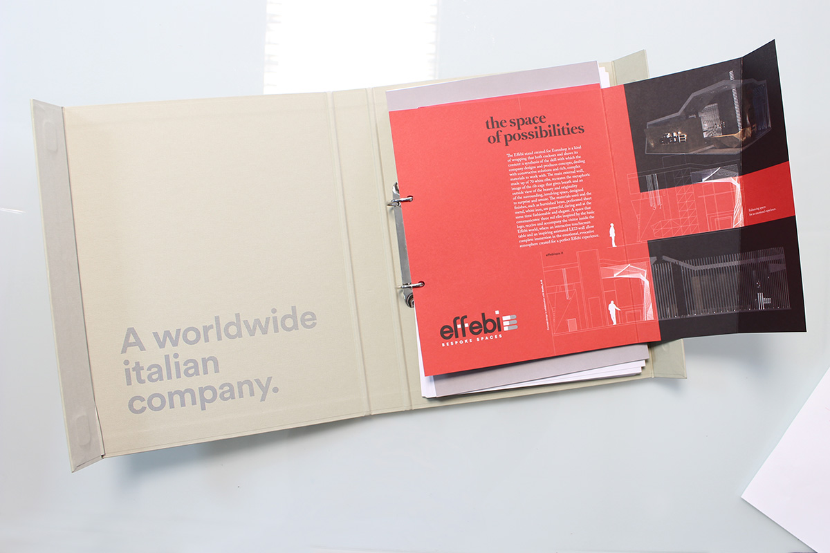 Il progetto: un raccoglitore ad anelli con chiusura magnetica, rivestito da tela marcata e serigrafata. Al suo interno un company profile stampato su carta usomano con serigrafia UV lucida in copertina. Scheda presentazione stand fiera realizzato con fustellatura particolare e schede portfolio.