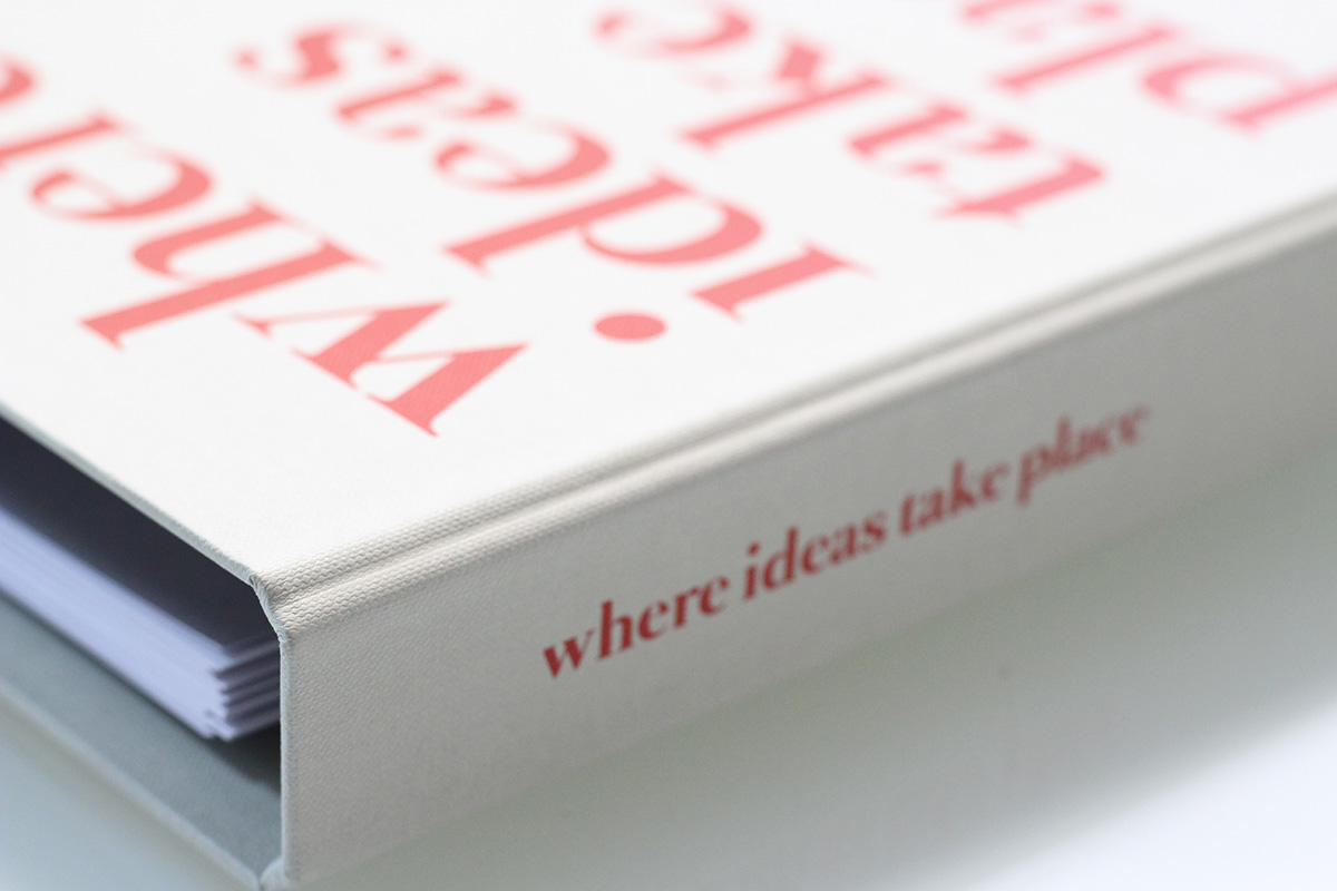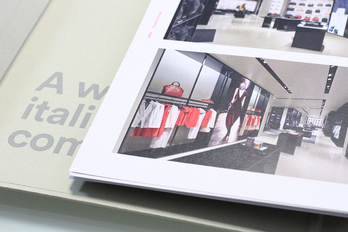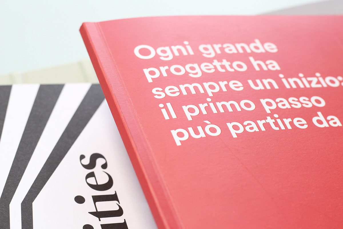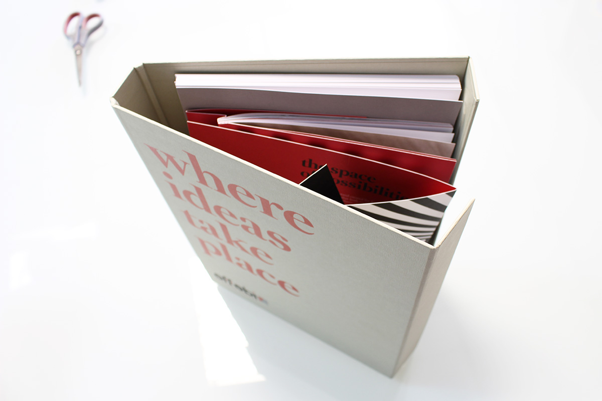 Il progetto: un raccoglitore ad anelli con chiusura magnetica, rivestito da tela marcata e serigrafata. Al suo interno un company profile stampato su carta usomano con serigrafia UV lucida in copertina. Scheda presentazione stand fiera realizzato con fustellatura particolare e schede portfolio.