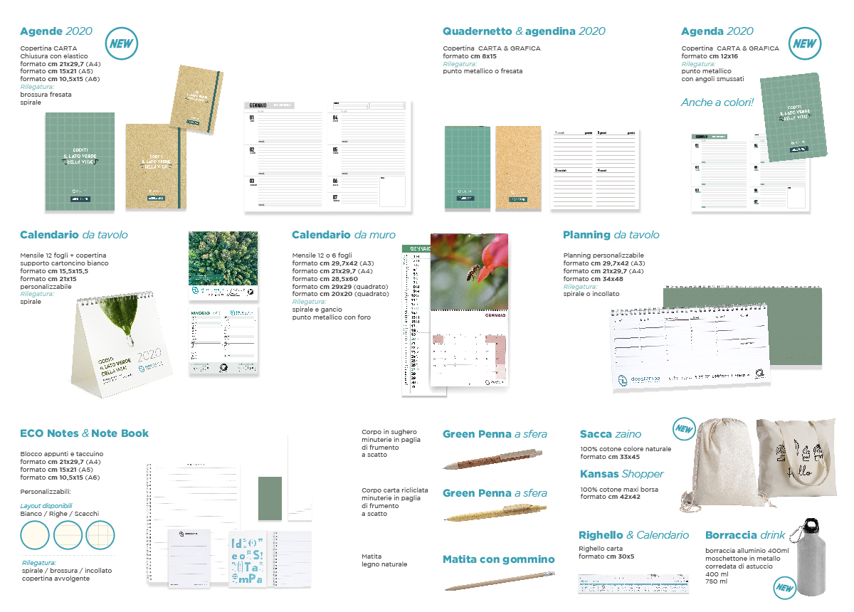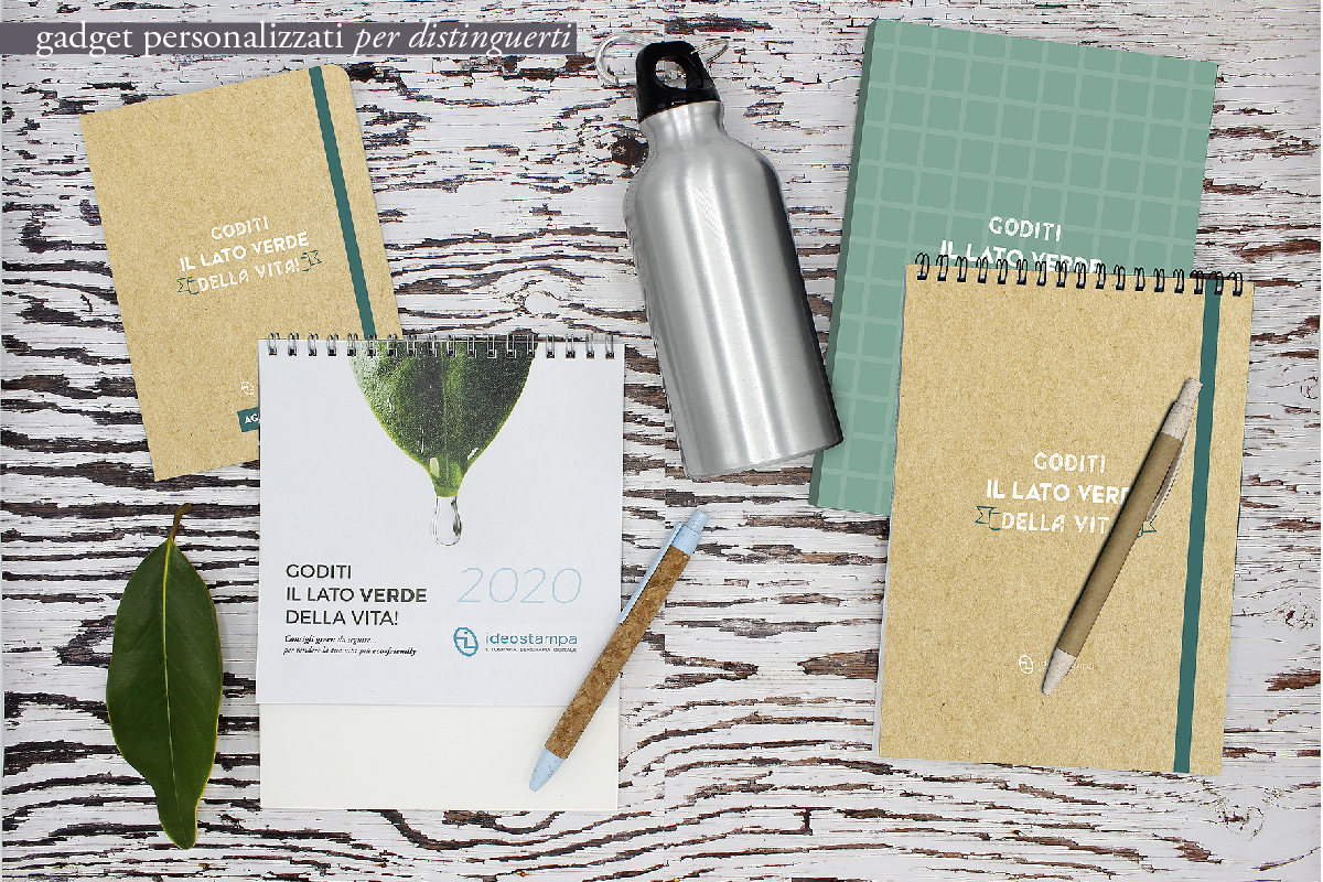 Per noi l’ambiente è una cosa seria. Per questo ci impegniamo giornalmente nel creare sempre nuovi gadget ecologici personalizzati in grado di adattarsi ad ogni vostra esigenza. Riciclare e rigenerare sono le parole chiave del futuro. ???? Nel nostro pieghevole troverete un’ampia scelta di gadget eco: dall’agenda stampata su carta certificata ecologica, alla borraccia 100% alluminio, alla matita in legno, allo zainetto in cotone riciclabile al 100%.